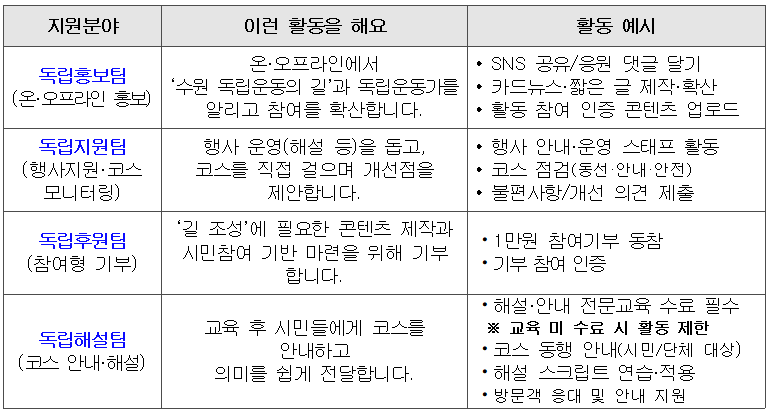 ⦁ 모집대상 : 수원의 독립운동 역사에 관심 있는 누구나(청소년·대학생·시민·단체·기업 등)