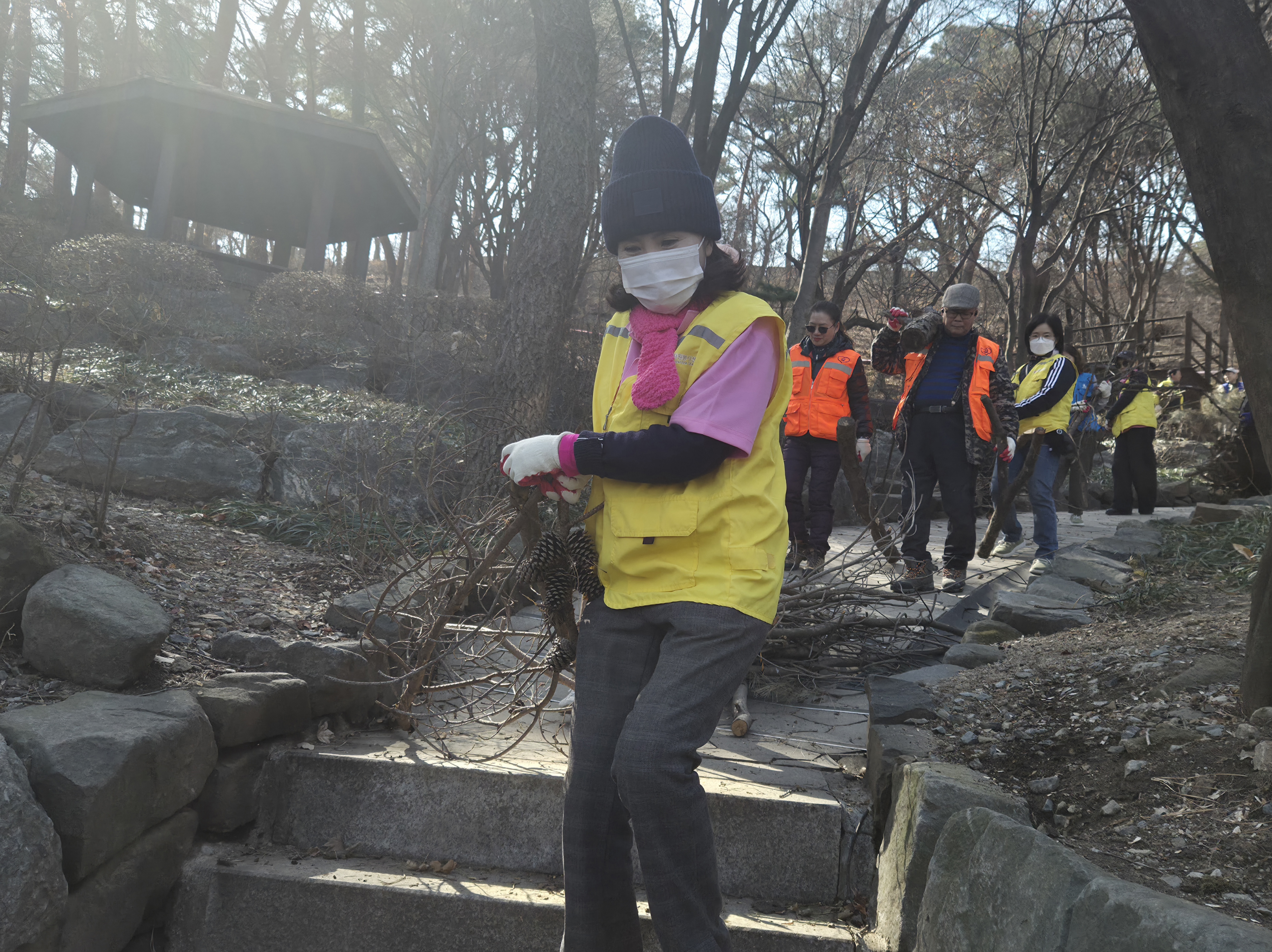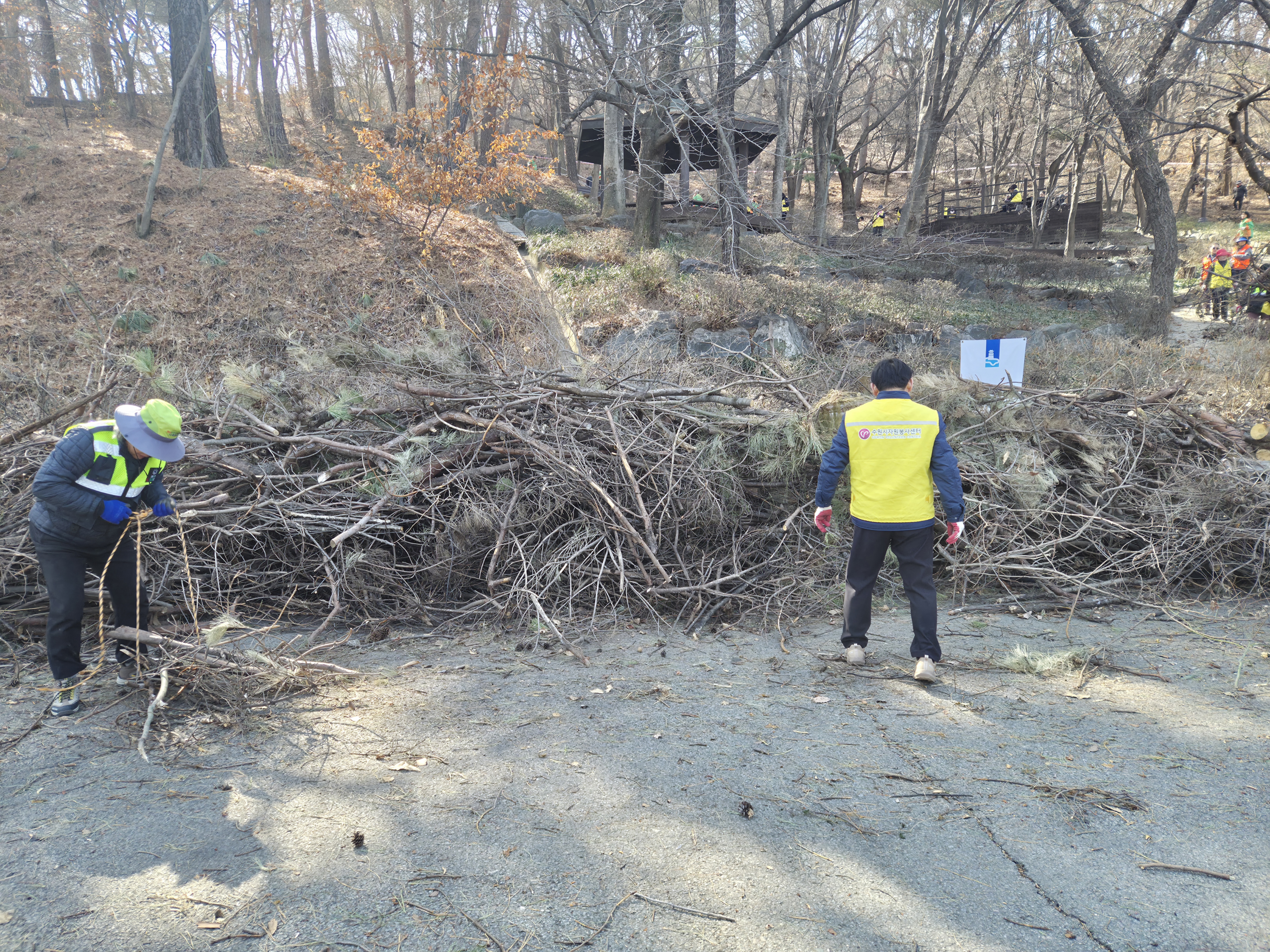 <자원봉사지들이 흩어져 나뭇가지를 치우고있는 모습>