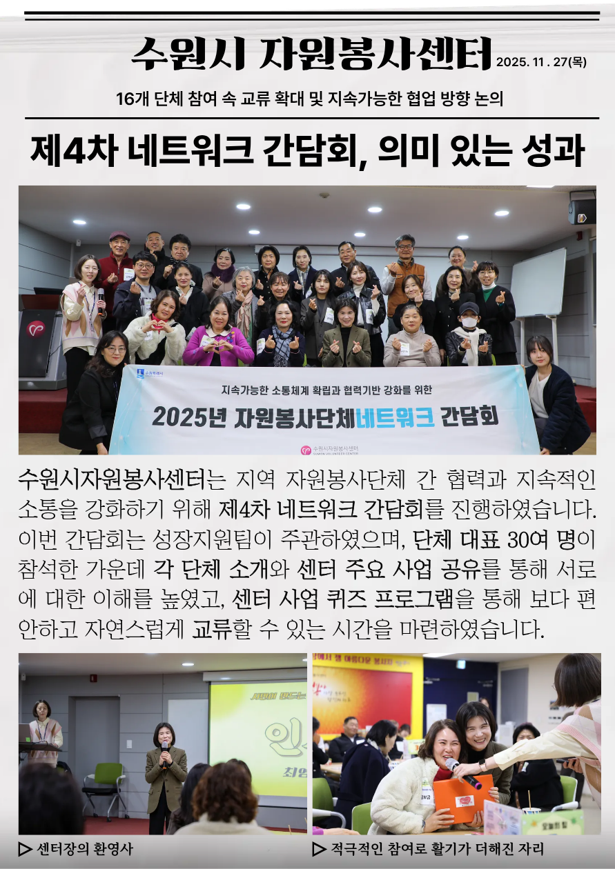 2025.11.27.(목) 수원시자원봉사센터에서 약 20여명 단체 대표들과 함께 자원봉사 단체 네트워크 간담회를 진행했습니다.