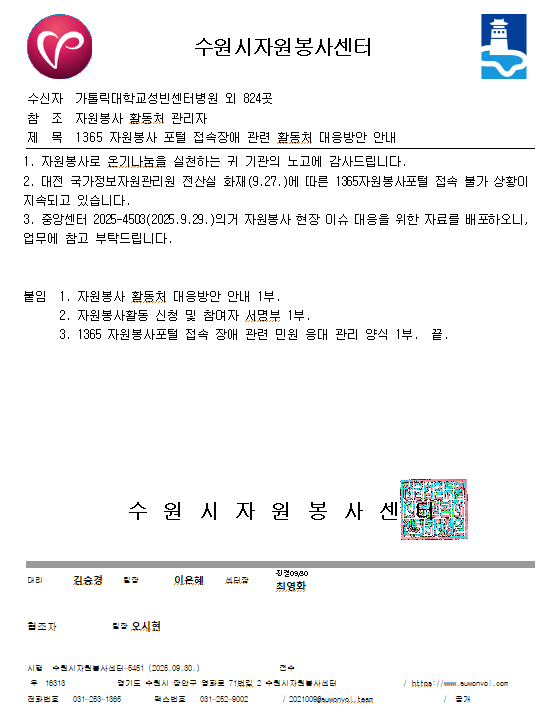 한국중앙자원봉사센터 공문(2025-4503) 의거 자원봉사 현장 이슈 대응을 위한 자료 배포하오니, 업무에 참고