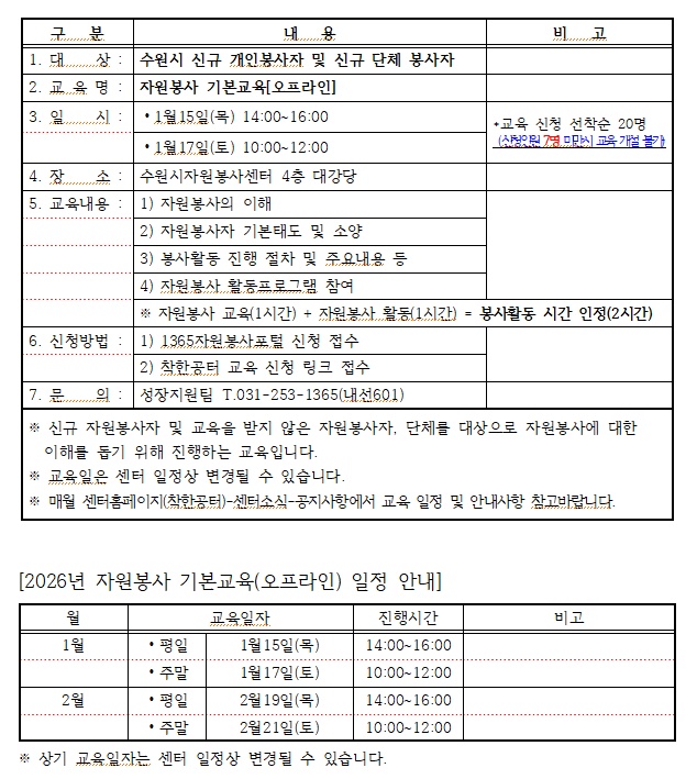 2026 수원시 신규 자원봉사자 및 신규 단체를 위한 자원봉사 기본교육[오프라인] 운영 안내