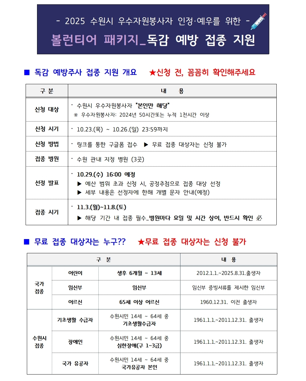 <<< 2025 수원시 우수자원봉사자 독감 예방접종 지원 신청 안내 >>>
