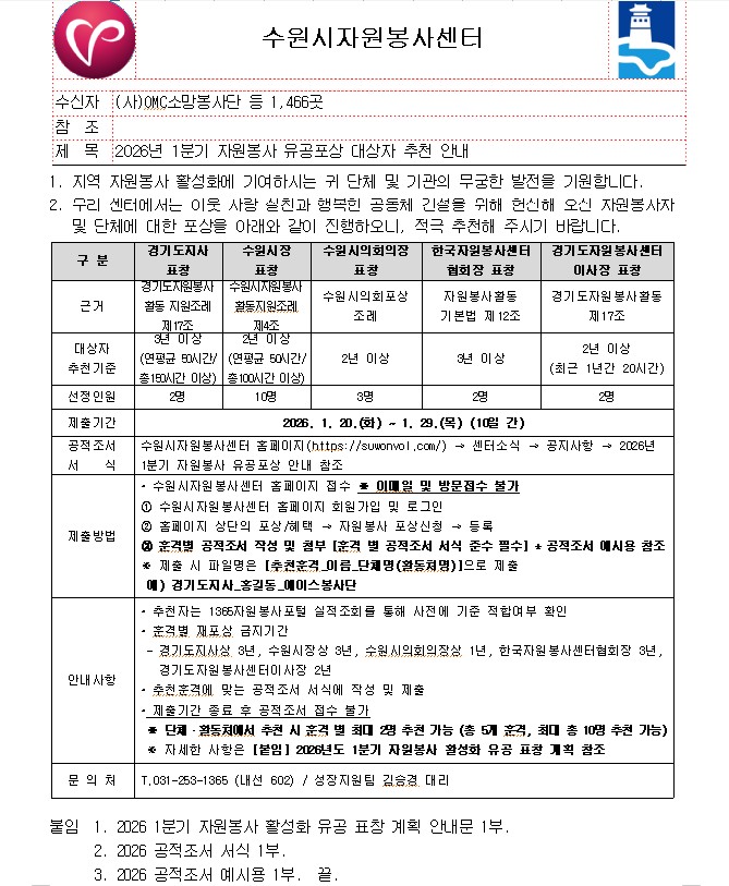 2026년 1분기 자원봉사 유공포상 접수 안내 (접수기간: 1.20.(화)~1.29.(목))