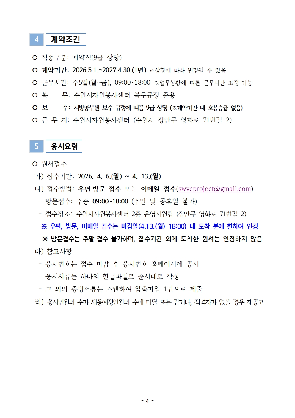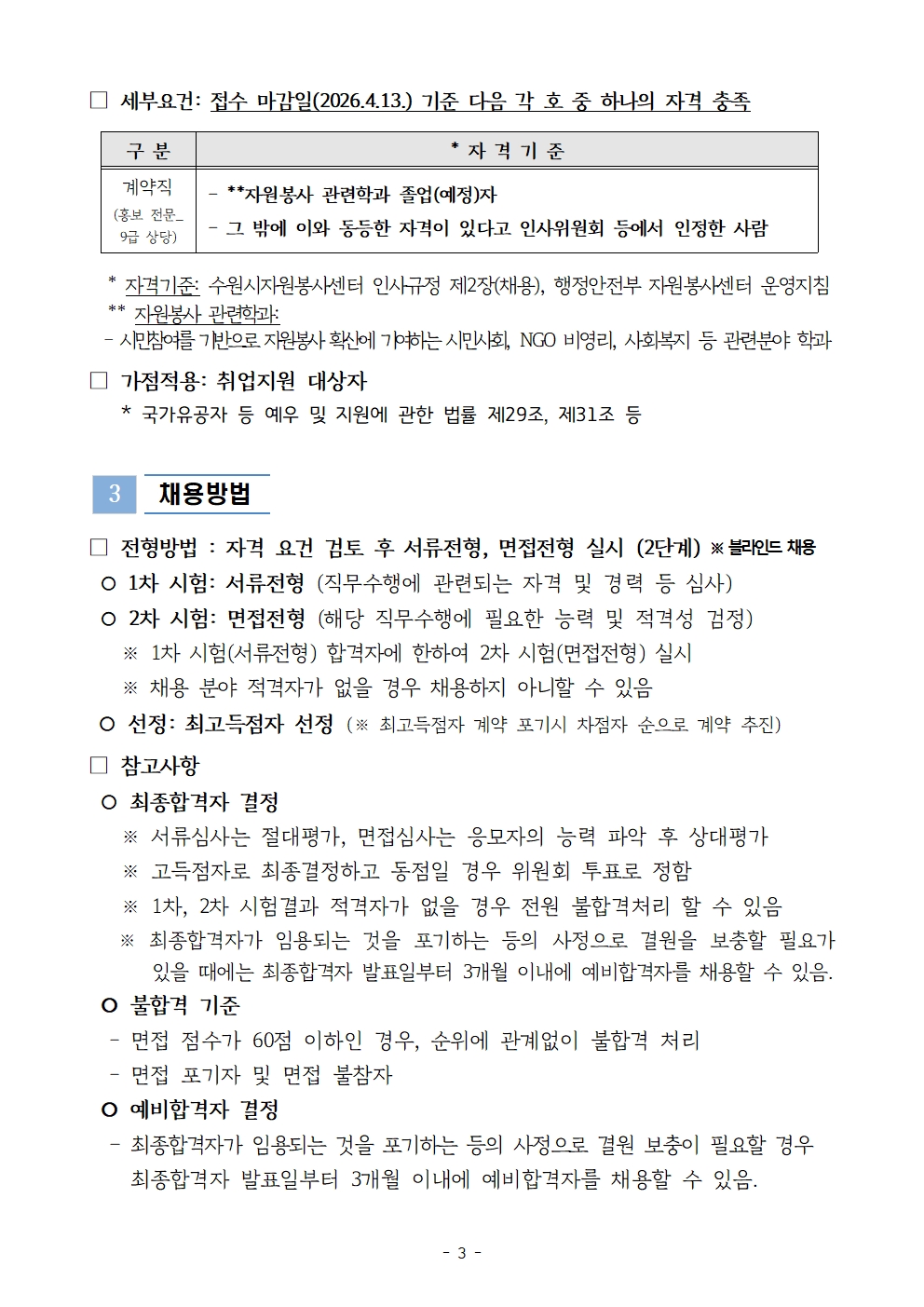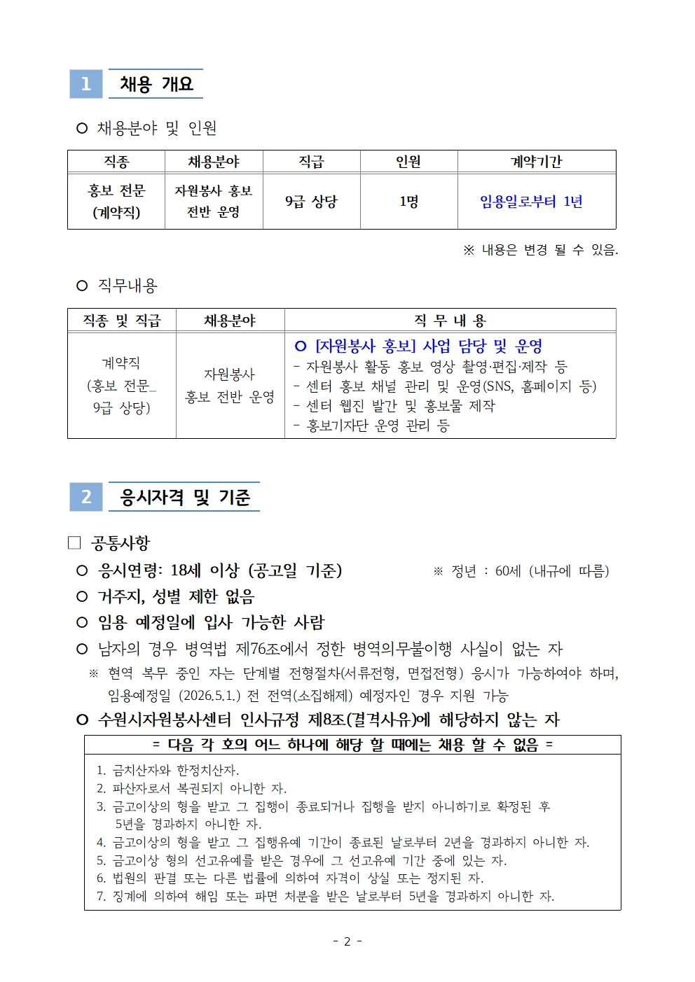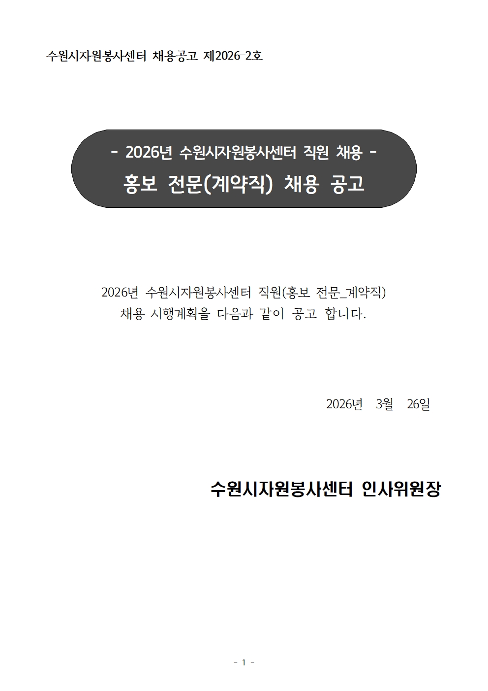 [채용공고] (제2026-2호) 수원시자원봉사센터 직원(홍보 전문_계약직) 채용 공고
