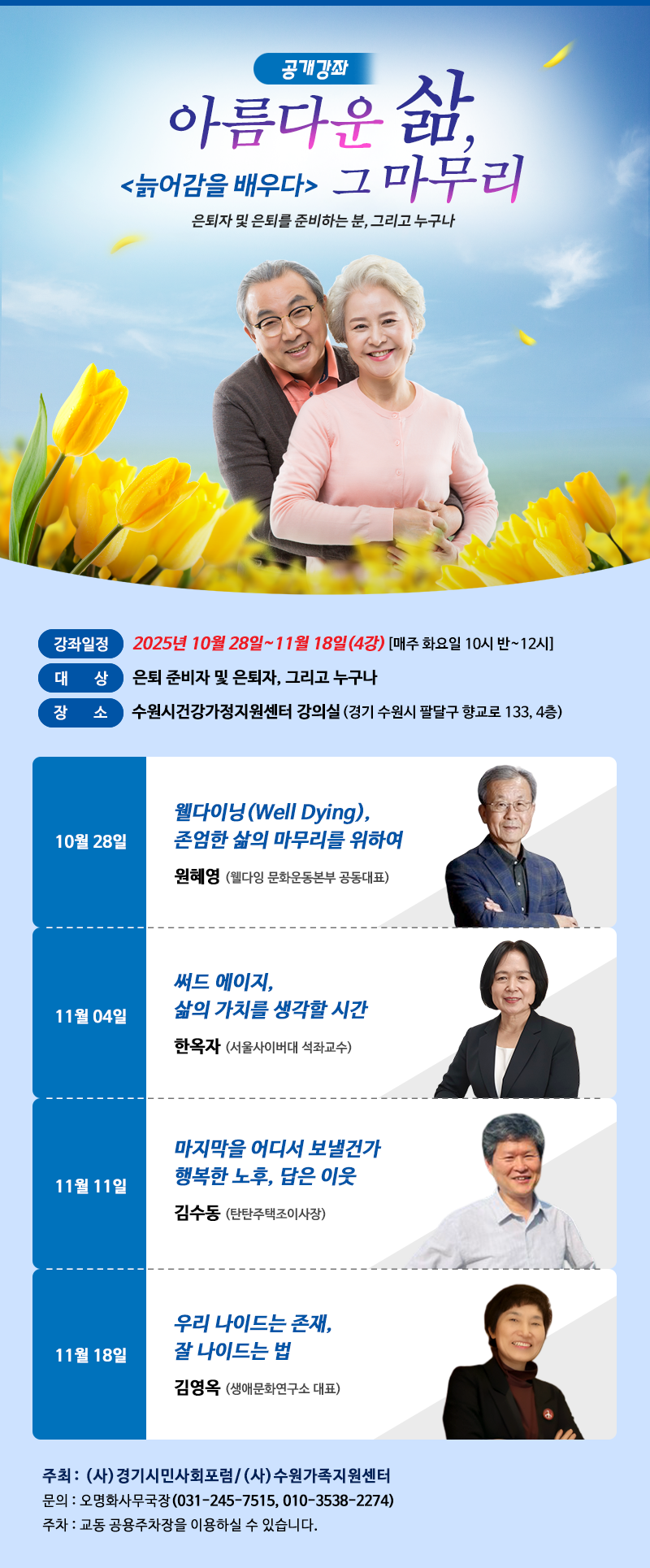 ○ 아름다운 삶 '늙어감을 배우다' 그 마무리 은퇴자 및 은퇴를 준비하는 분, 그리고 누구나 참여 가능