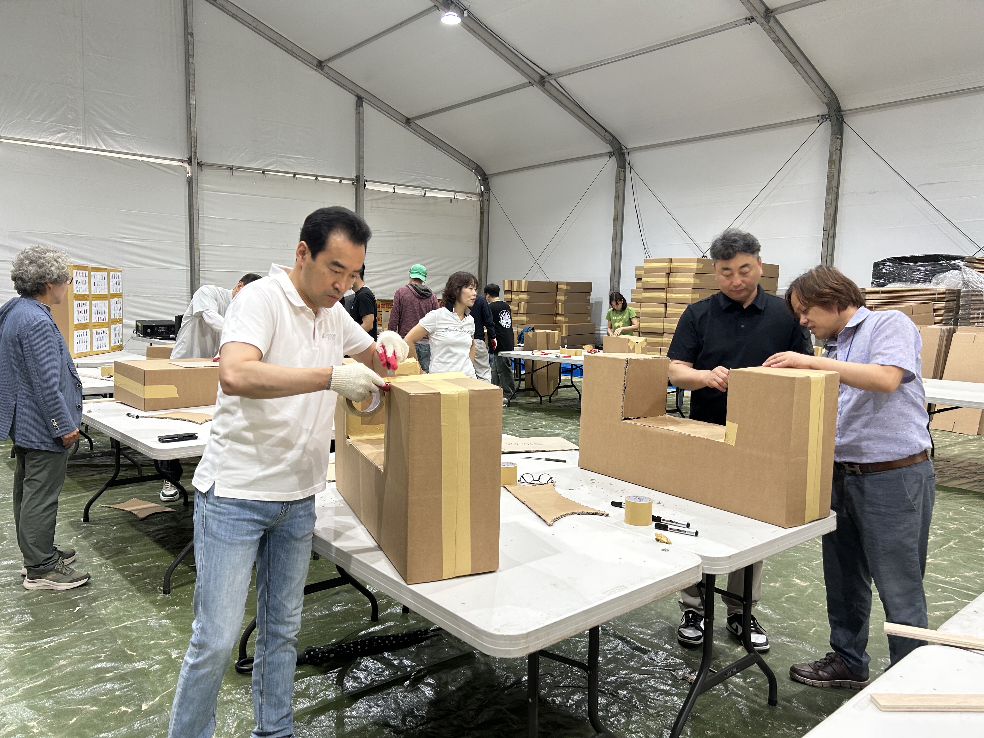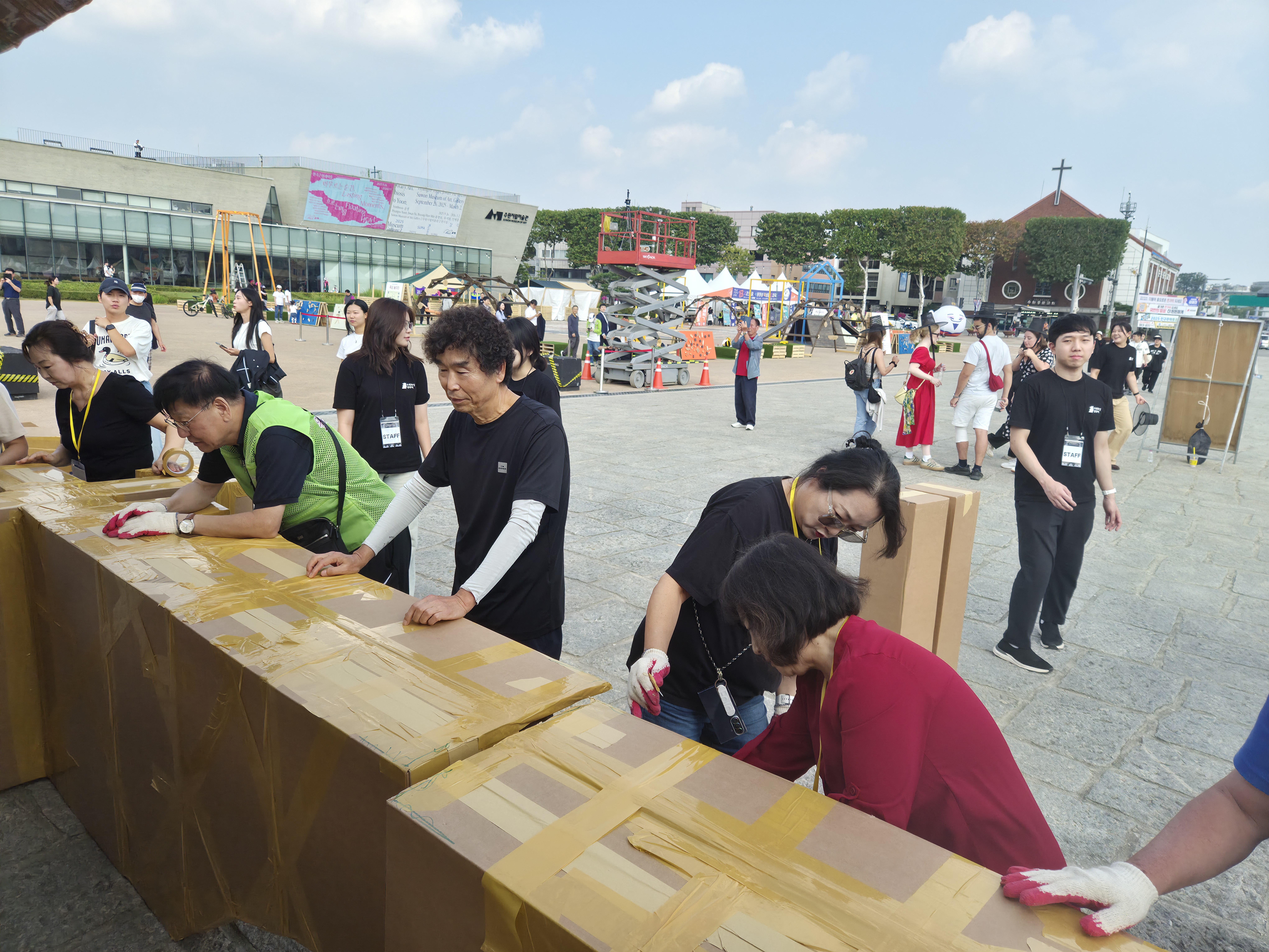 제62회 수원화성문화제의 막이 오르기 전, 수원화성행궁광장은 시민들의 활기로 가득했다. 우화관 앞에 설치된 TFS 텐트 안에서는 수원화성문화제 추진위원들과 시민들이 함께 종이상자를 자르고, 테이프로 붙이며 바쁘게 손을 움직였다. 이 상자들은 곧 ‘팔달문’을 재현할 주요 재료가 되어, 특별한 시민참여형 프로젝트 ‘시민의 건축 팔달’의 첫걸음을 내디뎠다.