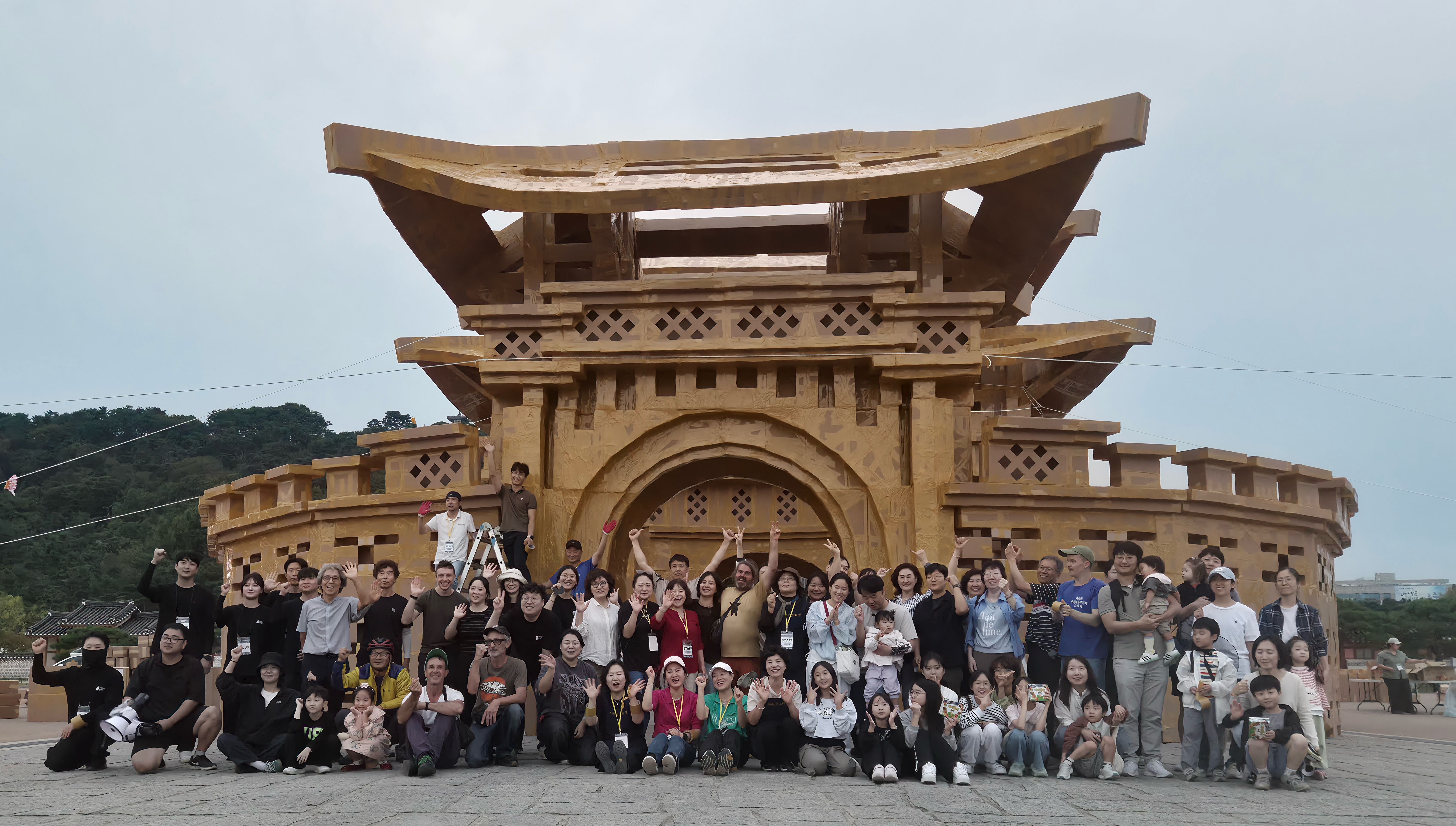 시민들이 완성한 수백 개의 종이상자는 화성행궁광장으로 옮겨져 하나의 거대한 구조물로 쌓아 올려졌다. 축성 과정은 단순히 상자를 겹치는 작업이 아니었다. 꼭대기부터 한 단씩 정교하게 맞추며, 여러 시민이 힘을 합쳐 들어 올리는 협동의 과정이었다. 어린이부터 어르신까지 세대가 함께 손을 맞잡은 현장은 어느새 거대한 건축 현장이자 하나의 공동체로 변했다. 이번 프로젝트의 설계는 프랑스의 건축가 올리비에 그로스테뜨(Olivier Grossetête)가 맡았지만, 진정한 건축가는 바로 시민들이었다. 시민들은 직접 상자를 제작하고 서로 이어 붙이며, 자신의 손으로 팔달문을 세웠다. 완성된 종이 팔달문 위에는 시민들의 소망이 담긴 작은 상자들이 하나둘 쌓였다. 가족의 건강, 지역의 발전, 개인의 꿈을 담은 상자들이 성곽 위에 올려질 때마다, 팔달문은 단순한 건축물을 넘어 시민의 염원과 희망으로 완성된 상징물로 빛났다.