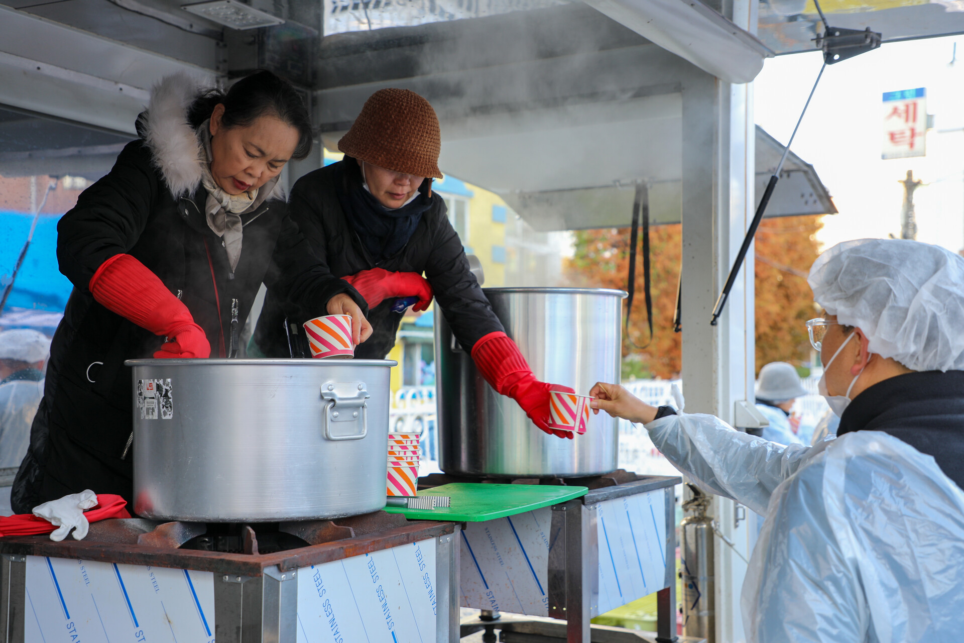 [추운 날씨 속에서도 따끈한 어묵탕과 떡 간식이 제공되며 봉사자들에게 잠시 휴식과 온기를 전하는 모습]