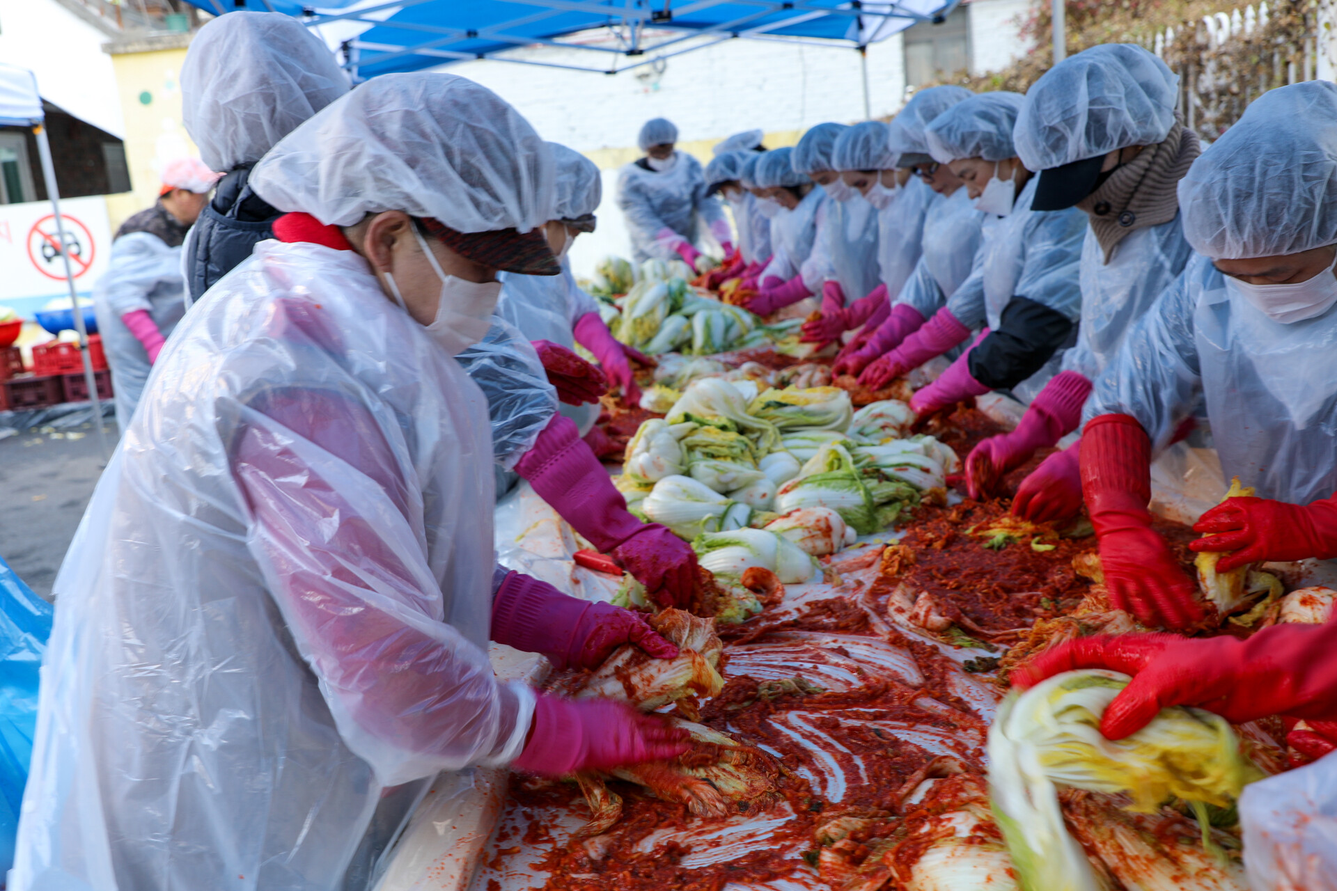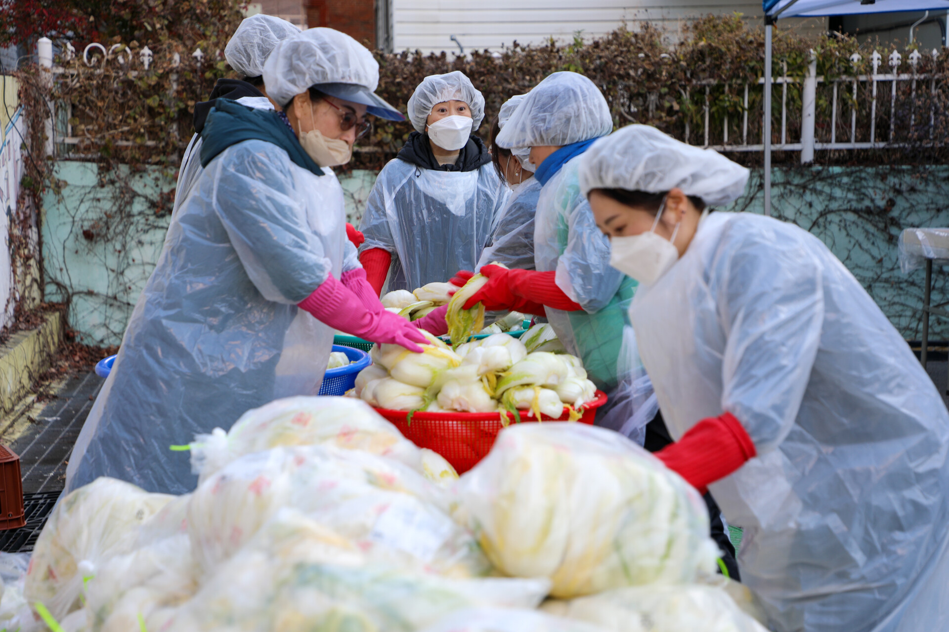 [자원봉사자들이 김치 속을 정성껏 버무리며 취약계층의 겨울 식탁을 위한 김장을 준비하고 있다]