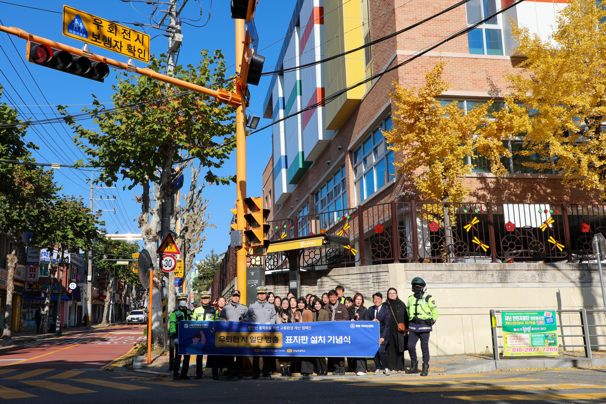 지난 14일 수원시 영통구 매탄 2동 산남초등학교 앞 사거리에서 안전한 통학로 개선을 위한 '우회전 시 보행자 확인 표지판' 설치 기념식이 열렸다.