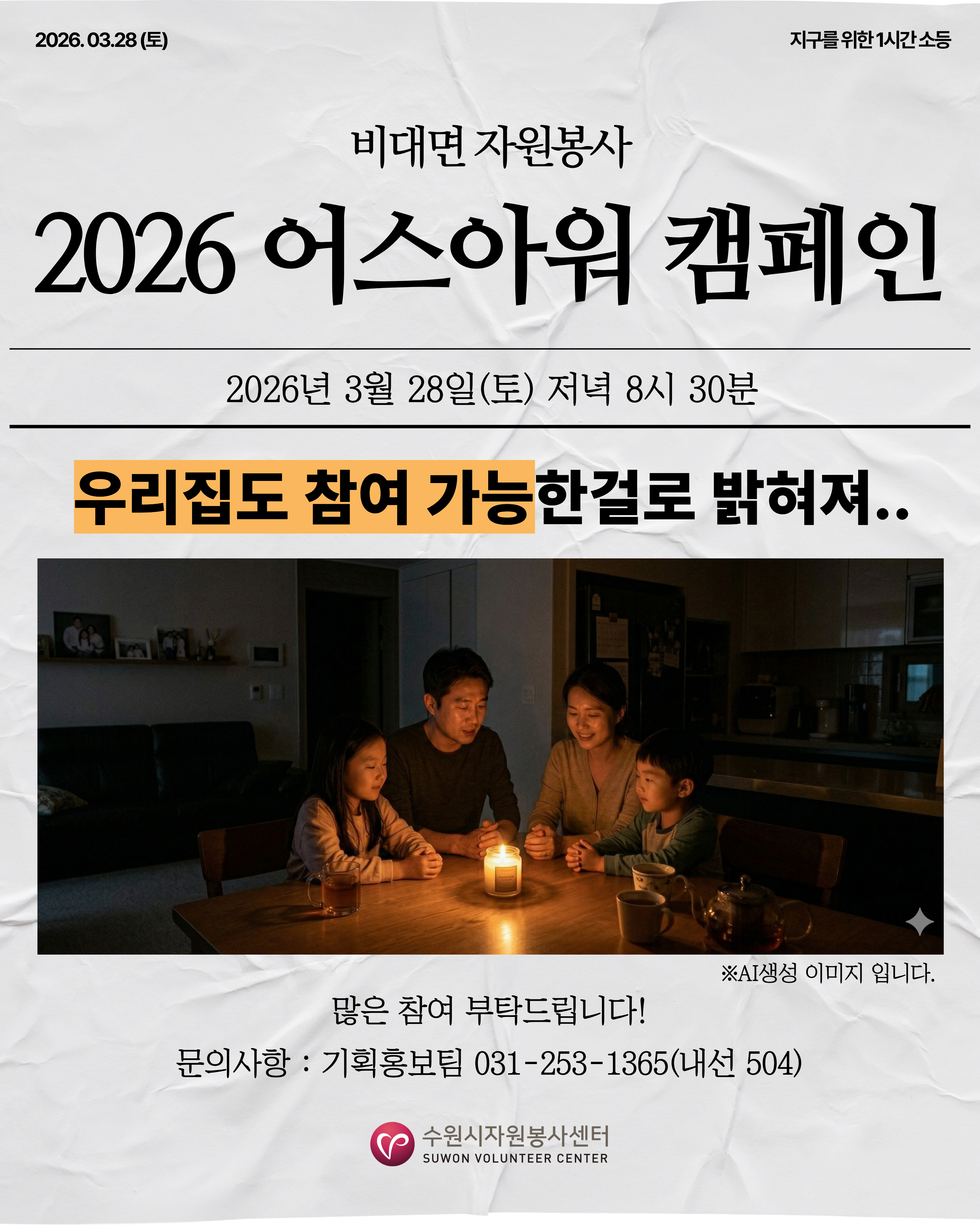 2026 어스아워(Earth Hour)_지구를 위한 1시간 소등 캠페인★봉사활동 인정을 위해서는 ① 참여후기 댓글 등록, ② 환경교육 영상 시청, ③ 환경교육 영상 퀴즈 풀기