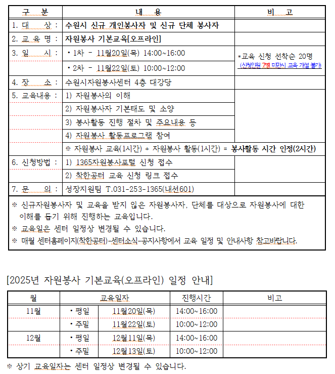 2025 수원시 신규 자원봉사자 및 신규 단체를 위한 자원봉사 기본교육[오프라인] 운영 안내