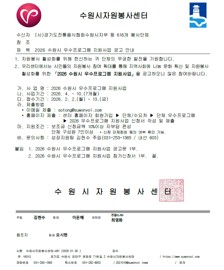 - 이메일접수 : sotong@suwonvol.com(파일명 : 단체명_수원시 우수프로그램 지원사업 참가신청서)