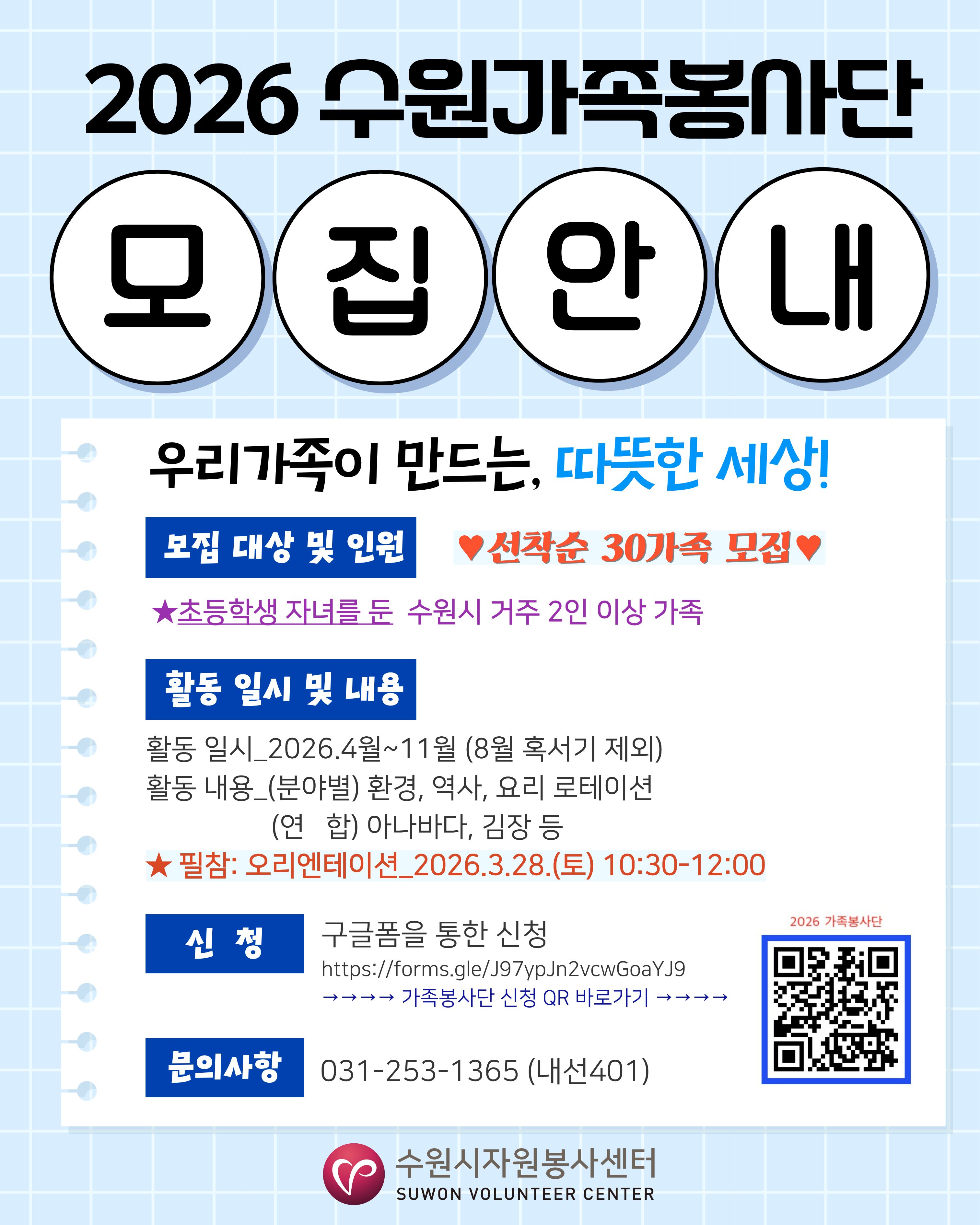 【모집 마감】 2026 수원 가족봉사단_우리가족이 만드는 따뜻한 세상, 가족봉사단을 모집합니다.