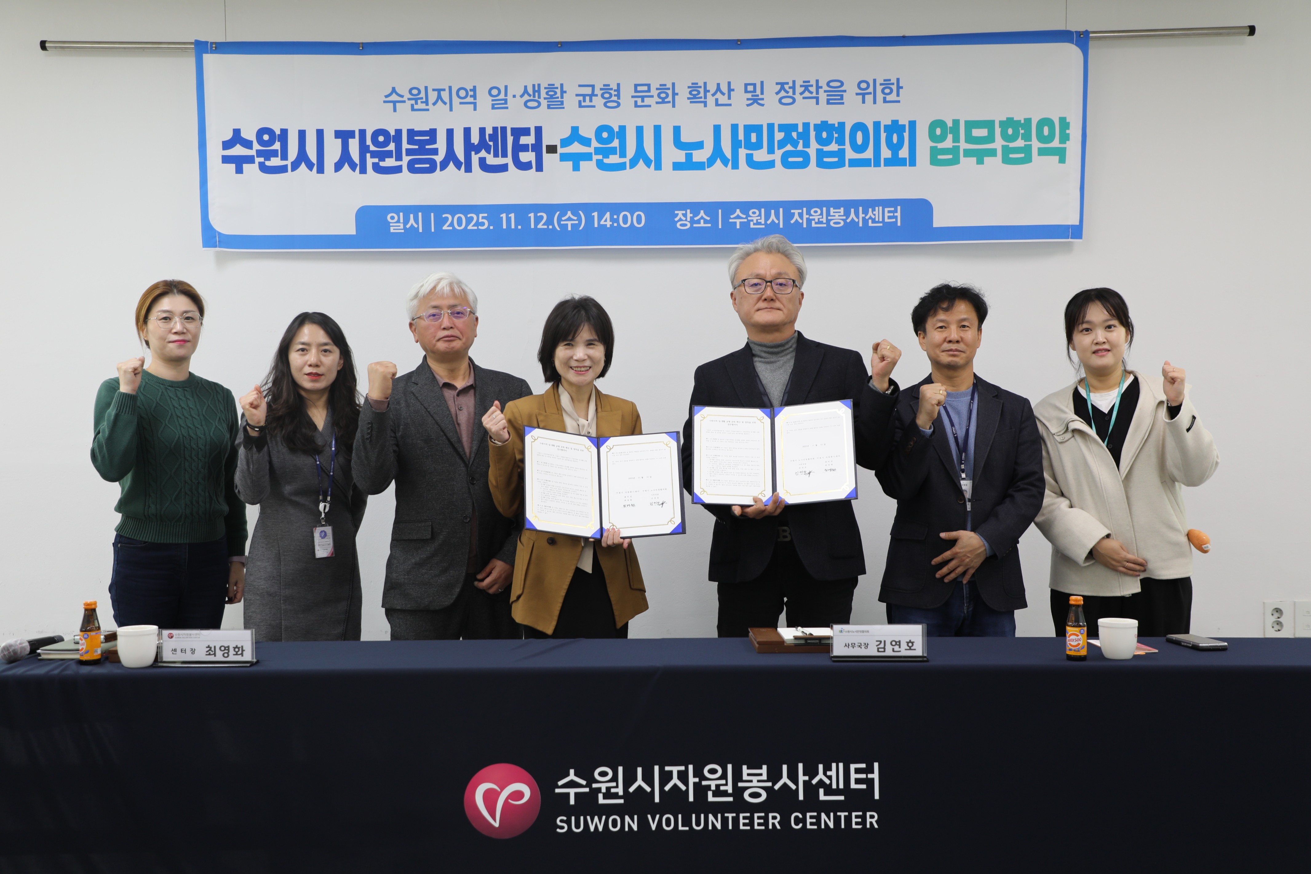 수원시자원봉사센터는 수원시노사민정협의회와 함께 「수원지역 일·생활 균형 문화 확산 및 정착을 위한 업무협약」을 체결했습니다.