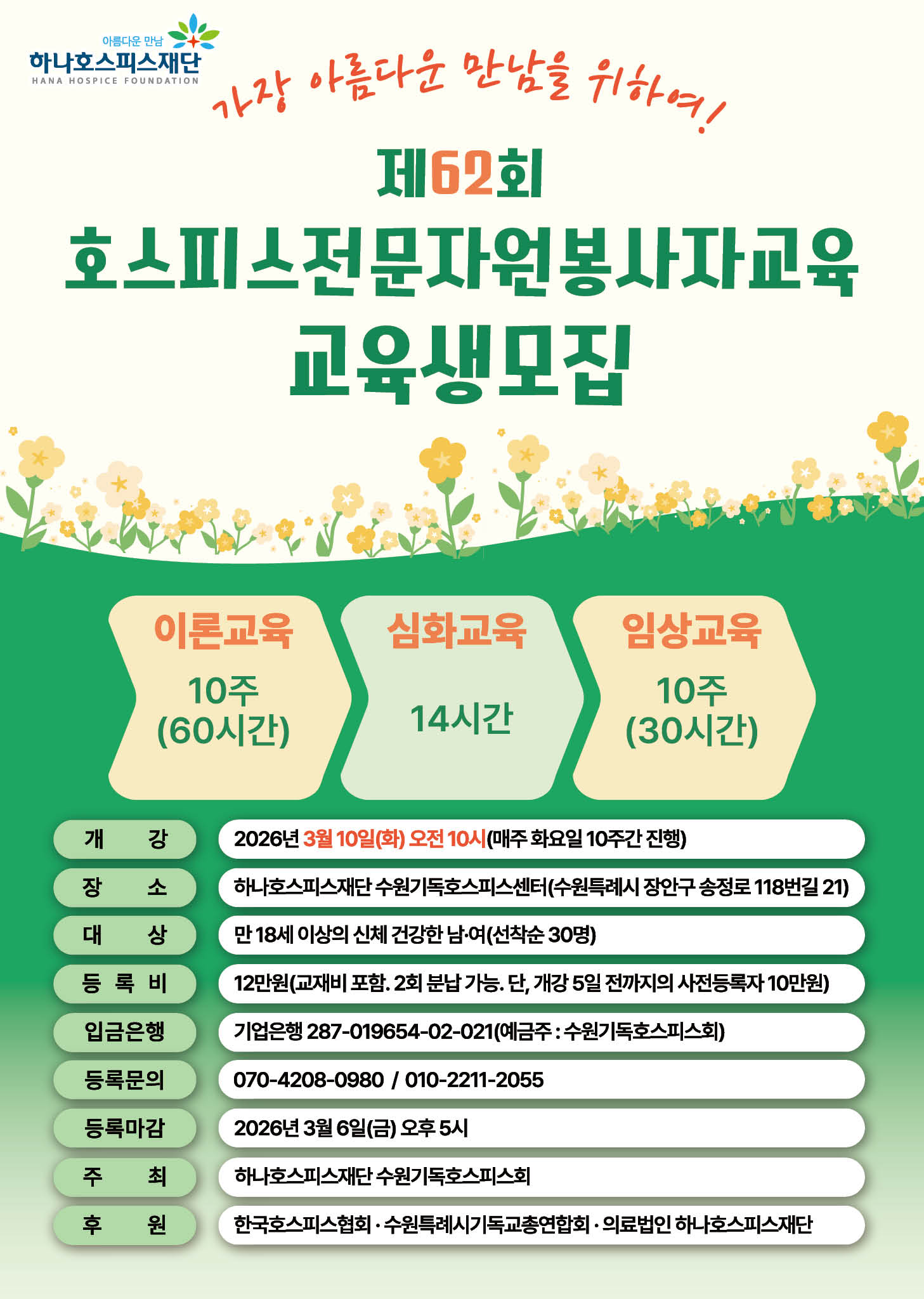 [하나호스피스재단] 제62회 호스피스 전문 자원봉사자 교육 모집 안내