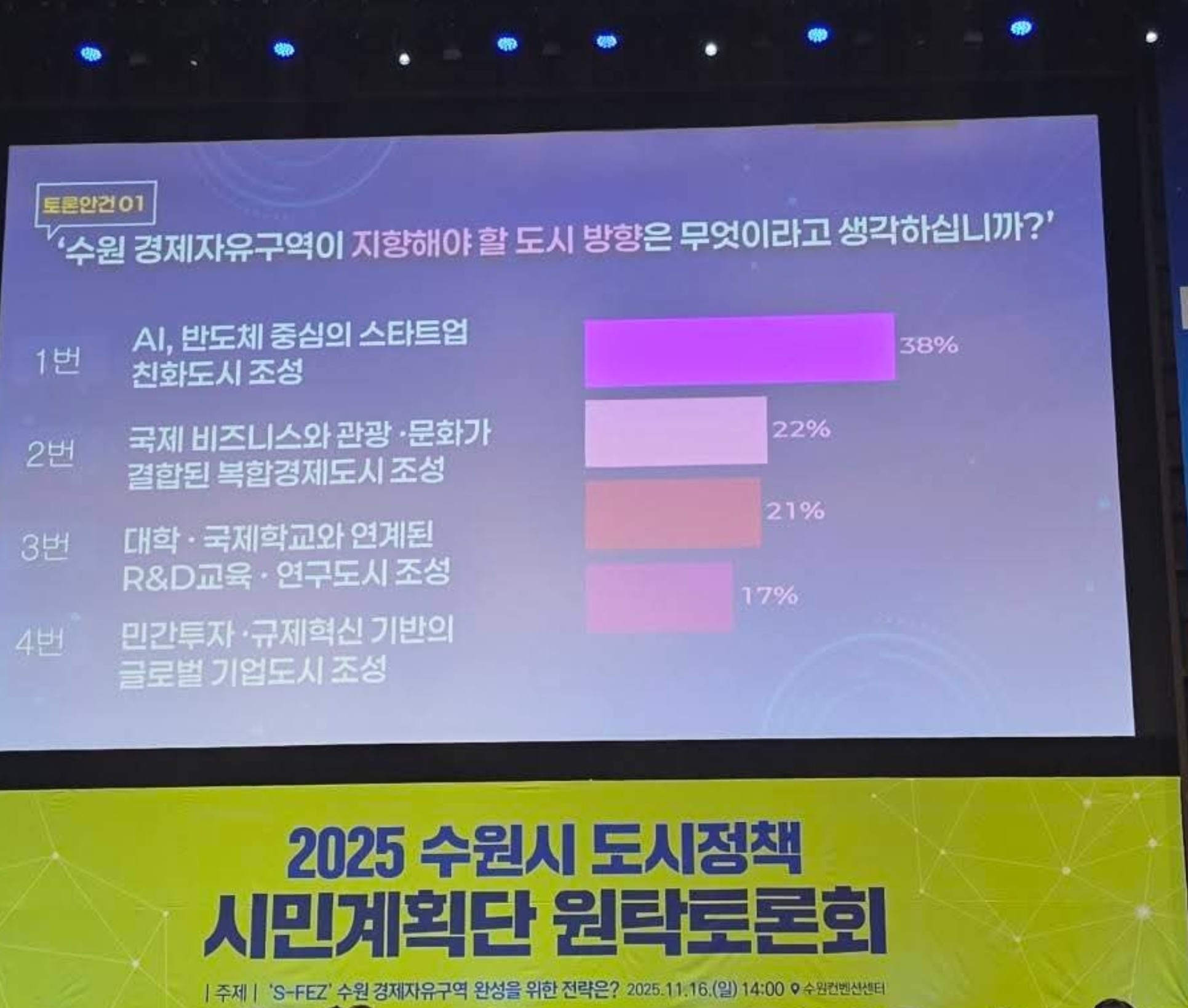 16일 수원컨벤션센터에서 열린 2025 도시정책 시민계획단 원탁토론회는 ‘S-FEZ 수원경제자유구역 완성을 위한 전략’이라는 주제로 진행됐고, 시민계획단과 청소년, 일반 시민 등 500여 명이 참석해 수원의 미래를 함께 그렸다. 수원은 오래전부터 우수 인재 기반, 편리한 교통 접근성, 안정적인 정주환경, 기업이 찾는 도시라는 평가를 받아왔다. 이날 토론에서도 '수원은 이미 준비된 도시'라는 공감대 위에, 앞으로의 발전 전략을 시민이 직접 제안하는 분위기가 이어졌다.
