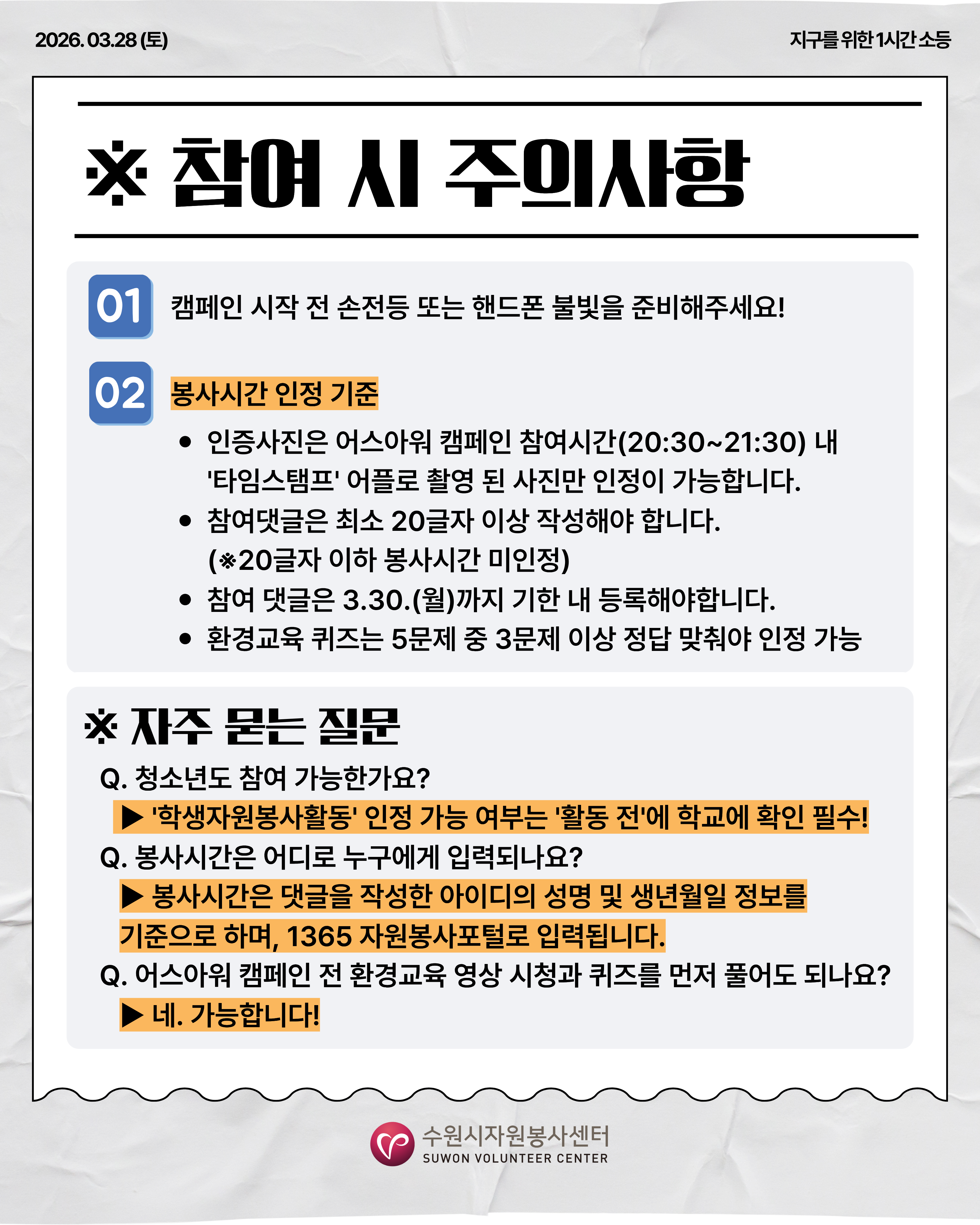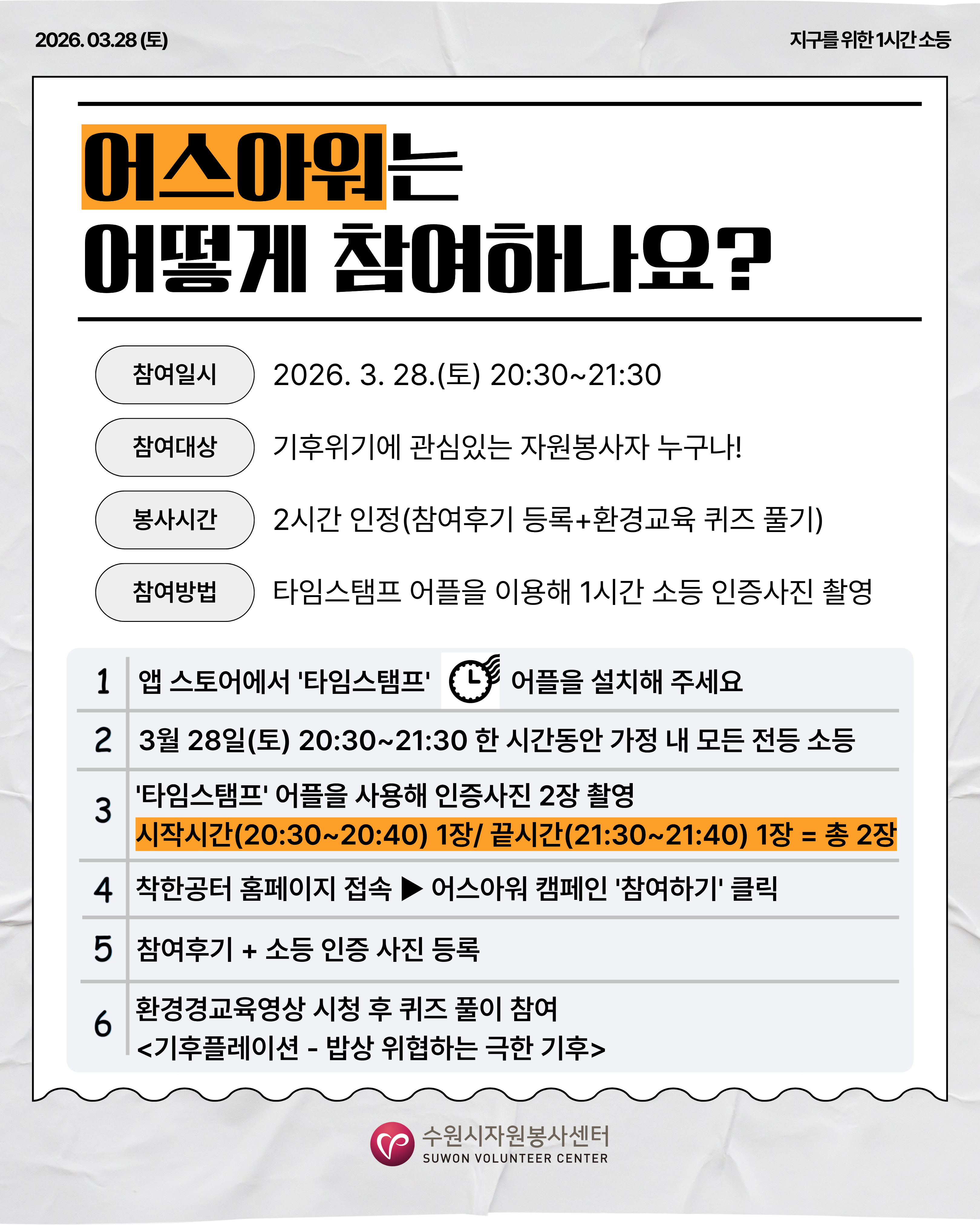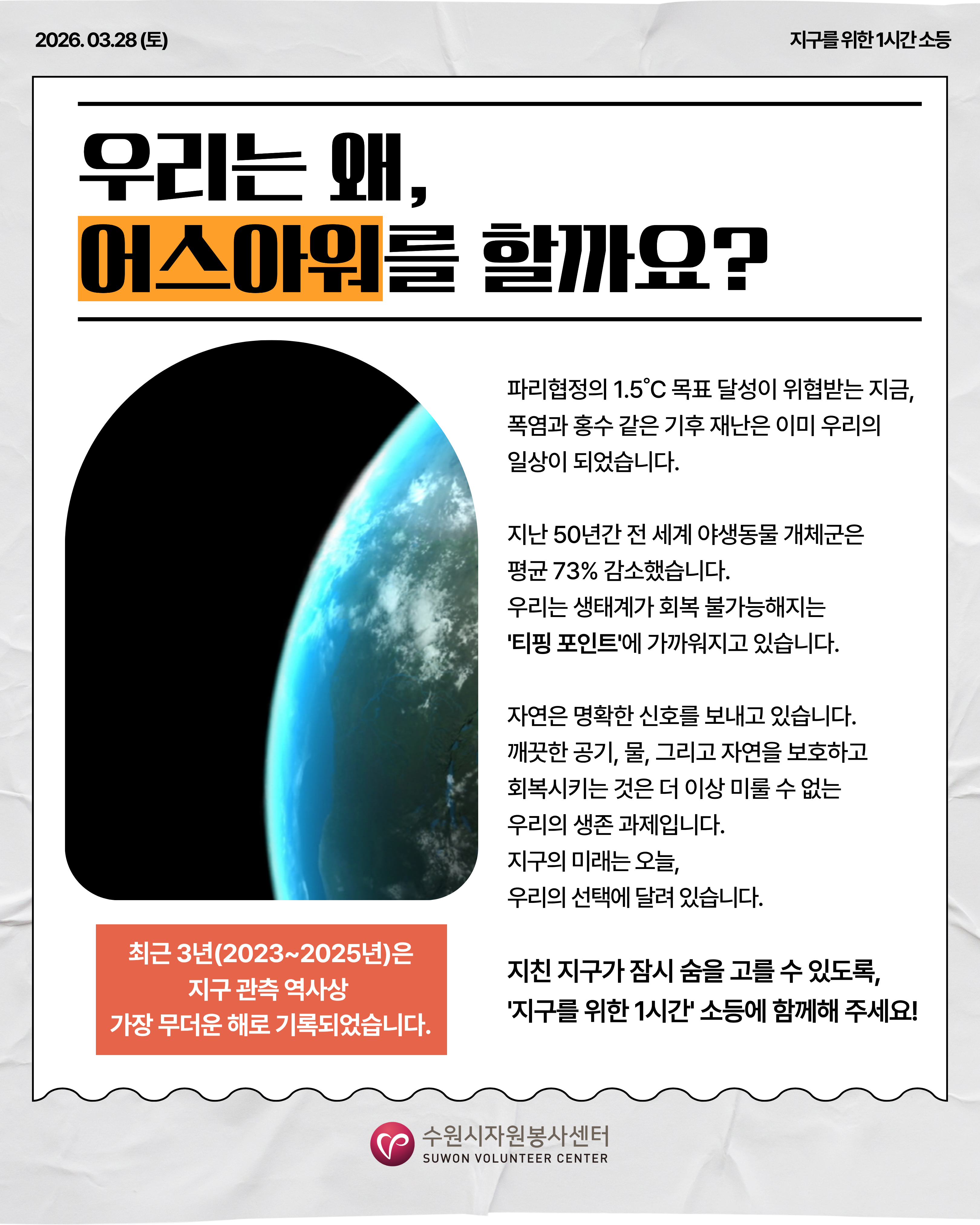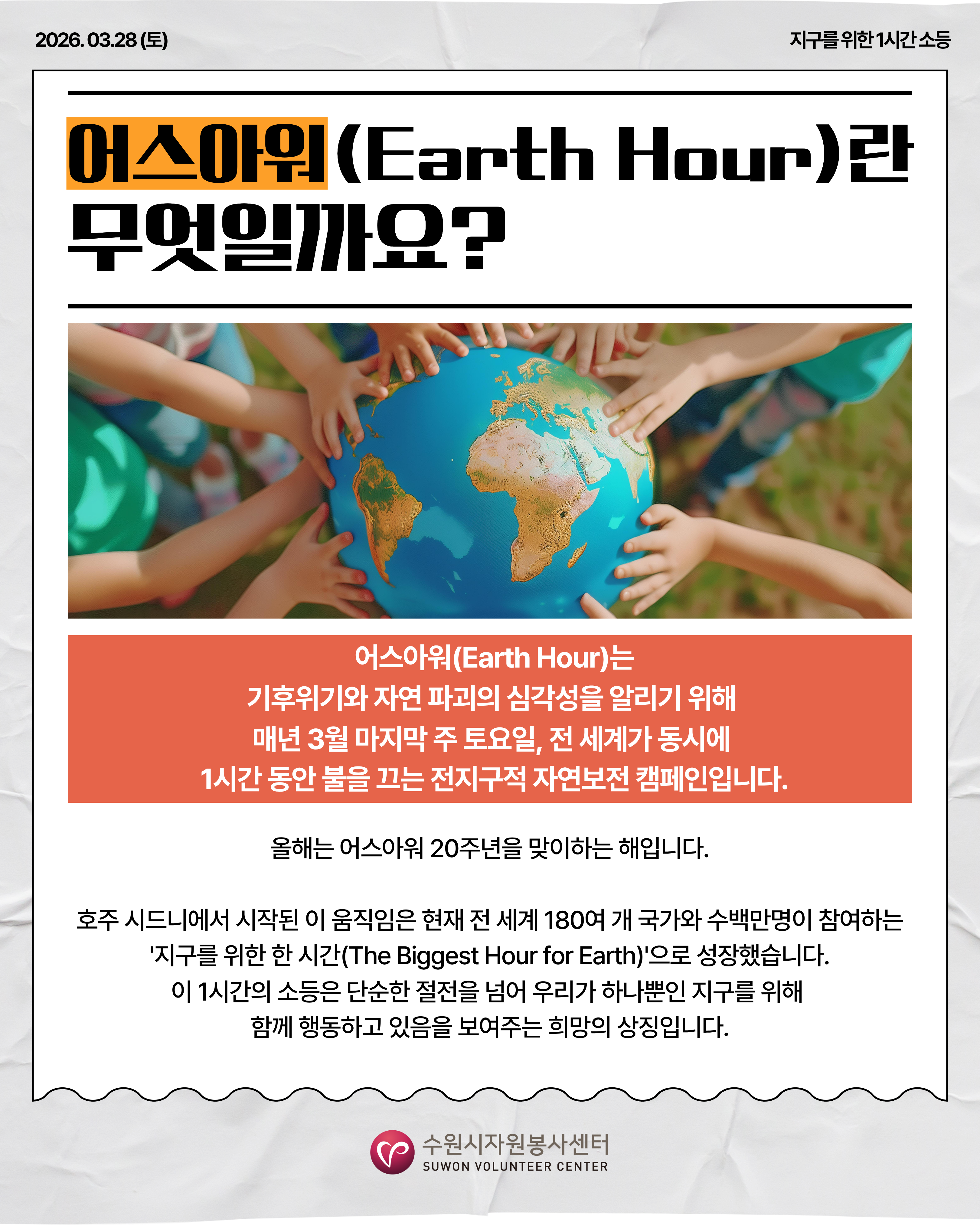 2026 어스아워(Earth Hour)_지구를 위한 1시간 소등 캠페인★봉사활동 인정을 위해서는 ① 참여후기 댓글 등록, ② 환경교육 영상 시청, ③ 환경교육 영상 퀴즈 풀기